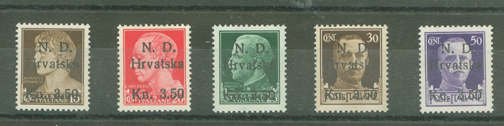 Croatia-Dalmatia(Sibenik) local Italy stamps surcharged "N.D. Hrvatska Kn. 3.50" issued in 1944 Each stamp has expert signature on back Never hingedAPS Stamp Id: 501928941