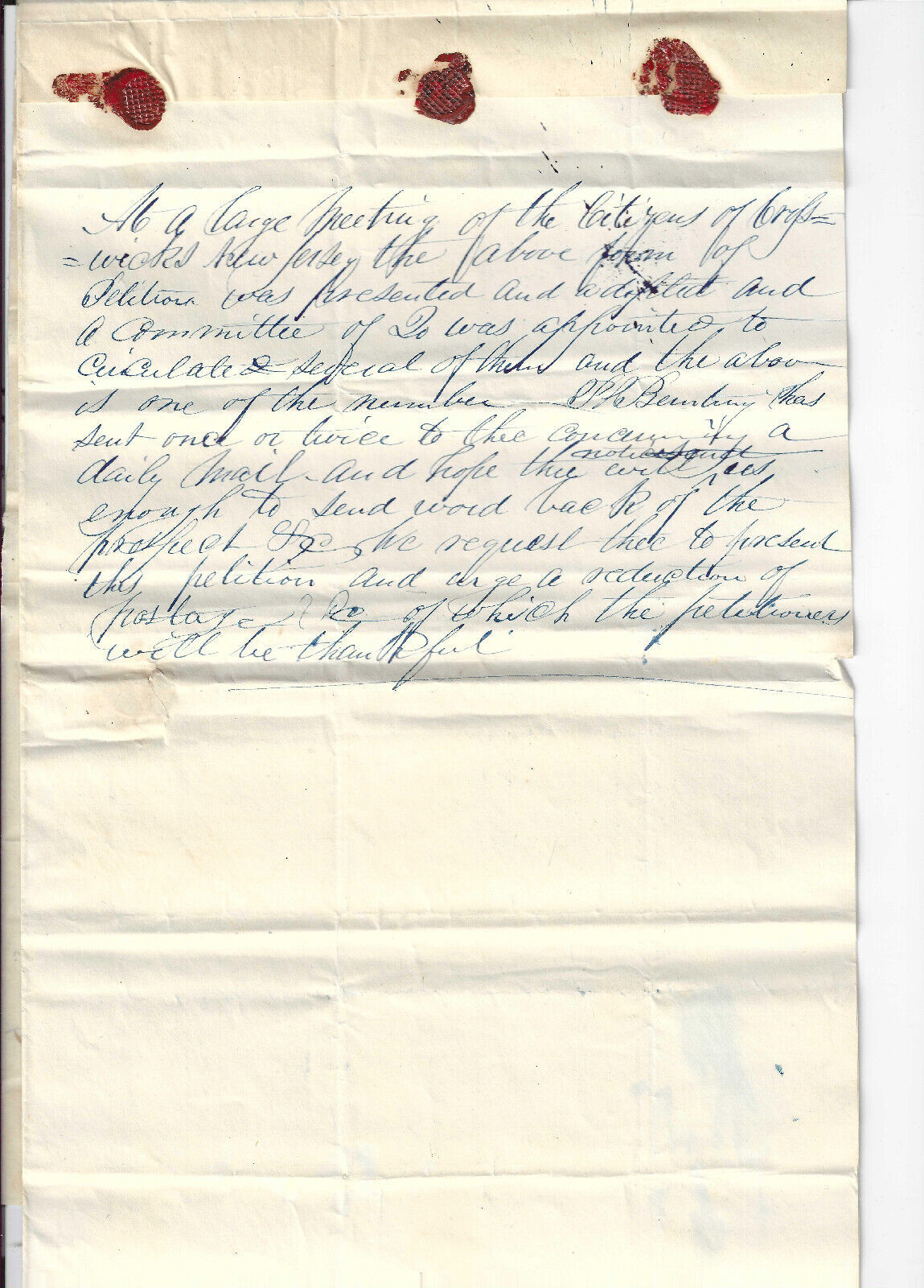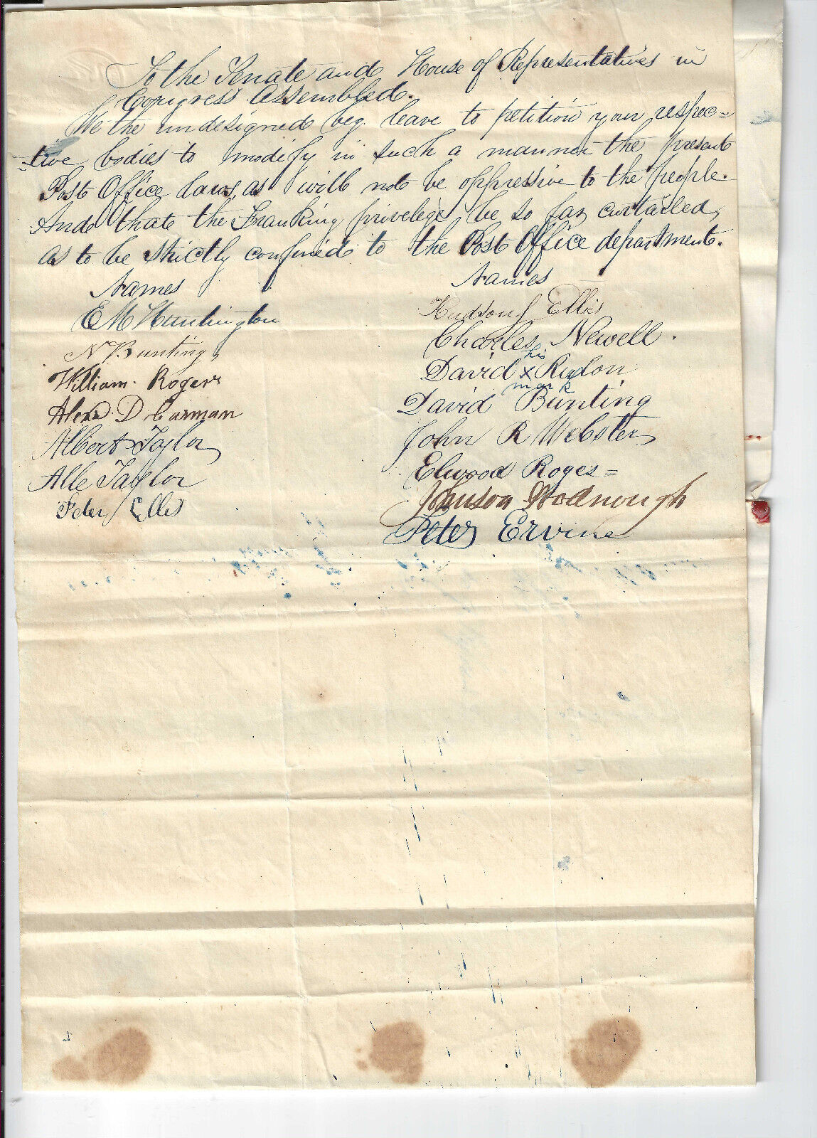 Circa 1840's petition signed by 15 citizens, sent to George Sykes Washington DC; minor creasing. Content: We the undersigned bet leave to petition your respective bodies to modify in such a manner the present post office lawsSeller Information