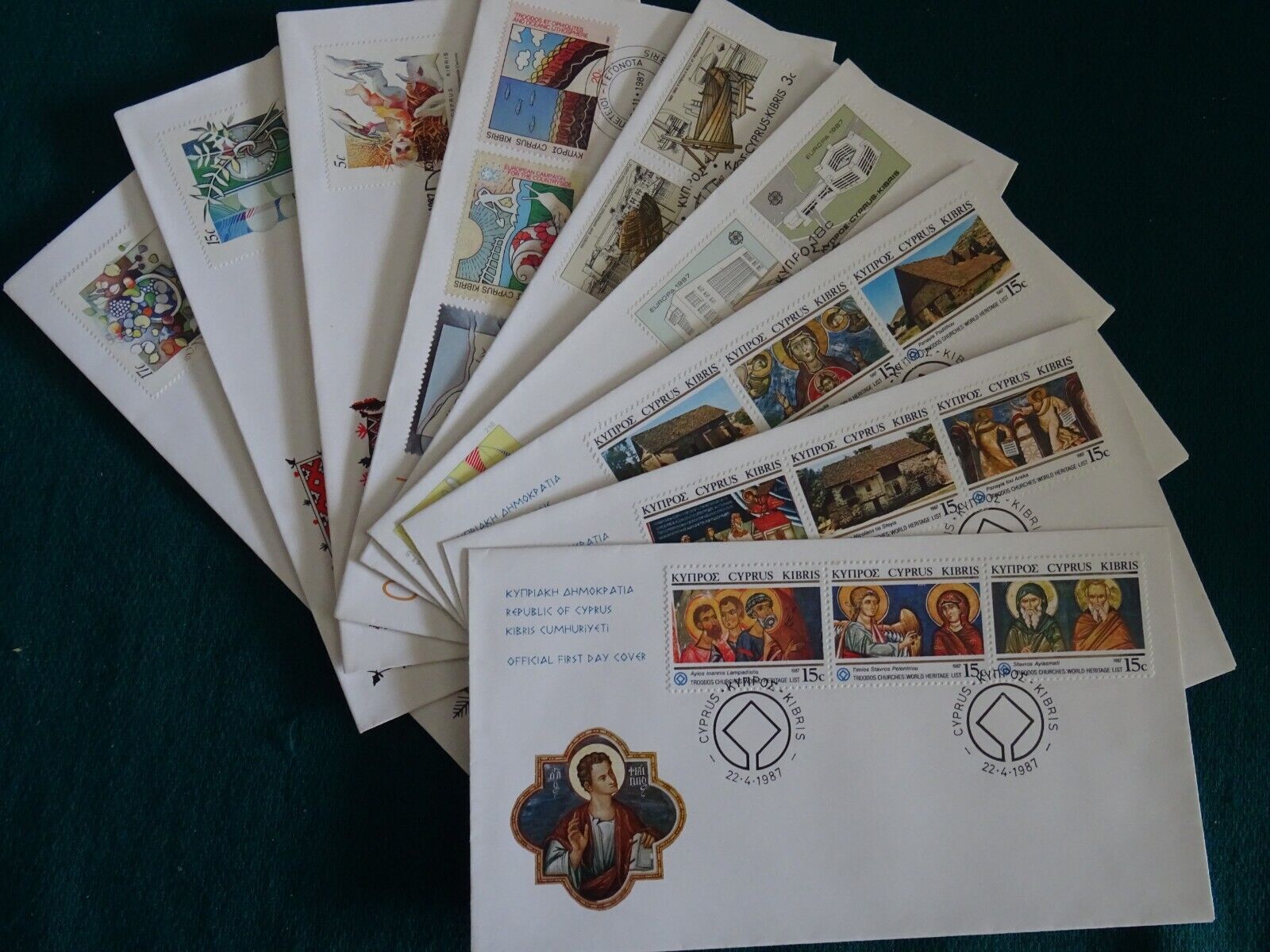 Cyprus 1987 Full Year Set FDC VF Sales Conditions- You are always need to wait our Invoice before you pay for your winning lot/s.- Lots or Combined shipping's with total price over than 30 Euro only by registered mail.- Buyer need to pay his winning lots in maximum 5 days after the auction end.- For the quality of the items, margins and / or perforation of stamps always look at the picture(s).- We are here to answer in any question about catalog numbers, condition or anything else you need.- All our auctions is As It Is and No Return unless something else described on Item Description.- For REGULAR shipping i decline any responsibility in case of loss or item stolen by the post office.- Terms used: MH=Mind hinged, MNH=Mind never hinged, MNG=Mint no gum, U=Used, XF=Extra fine, VF=very fine, F=fine.- Good and Happy Bidding