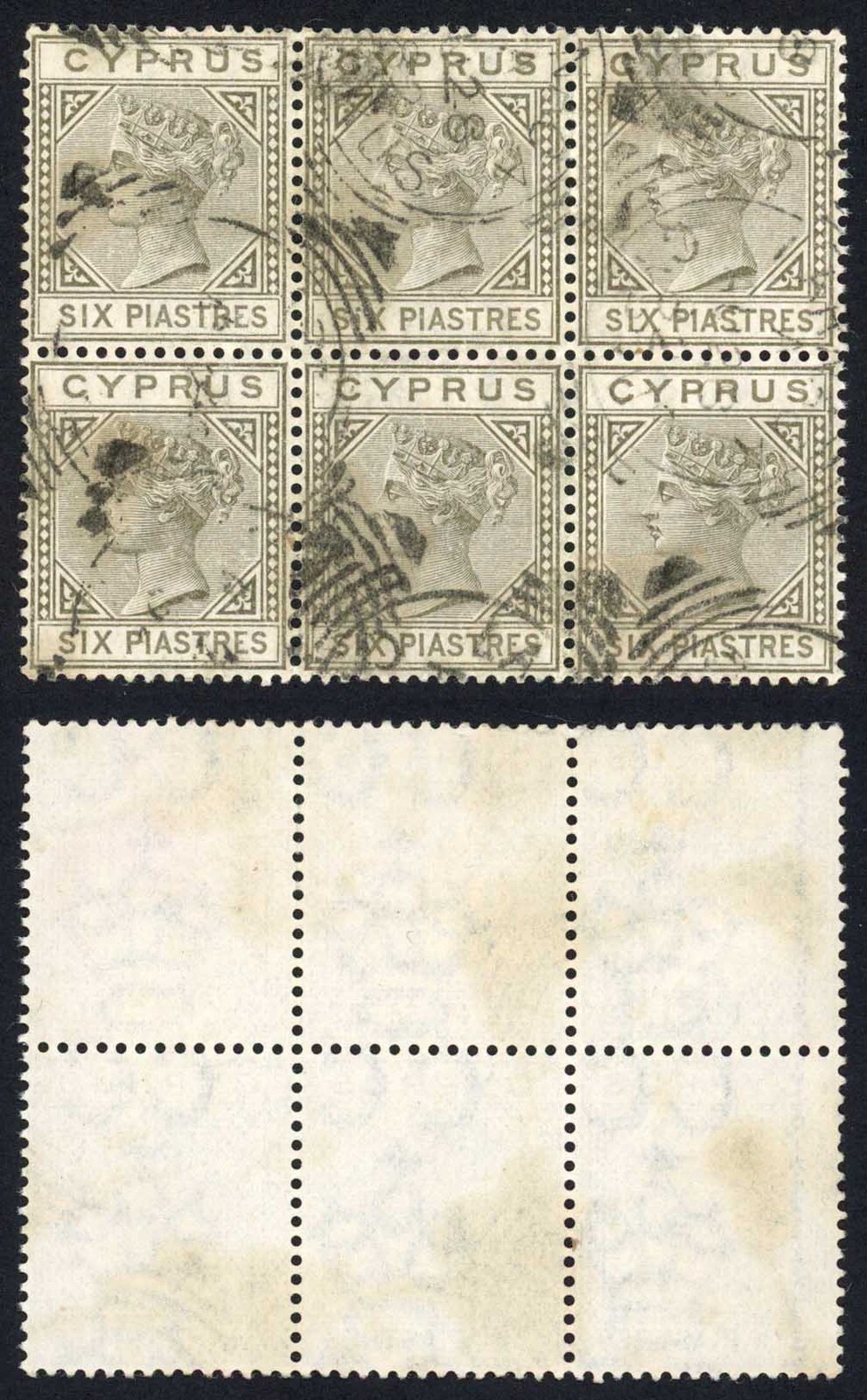 Cyprus SG15 1881 6pi olive-grey Wmk CC BLOCK of SIX EXCEEDINGLY RARE Cat 3300+++ Cyprus 1881 6pi olive-grey watermark CC BLOCK OF SIX (3x2) with watermark line at left used with Larnaca squared circles dated AU 28 8 ... Read More