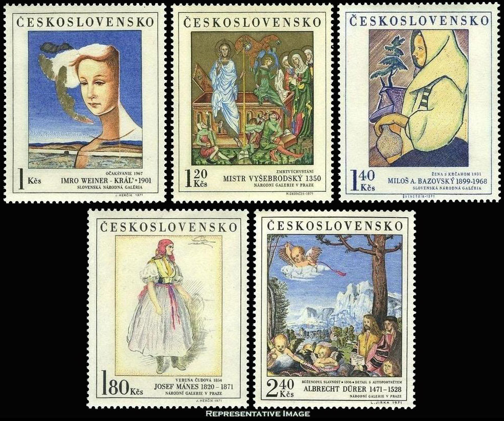 1K Waiting by Weiner-Krat, 1.20K Ressurection by Master of Vyssi Brod, 1.40K Woman with Pitcher by Bazovsky, 1.80K Veruna Cudova by Manes and 2.40K Detail from 'Feast of the Rose Garden by Durer Paintings. Mint never hinged.Seller Information