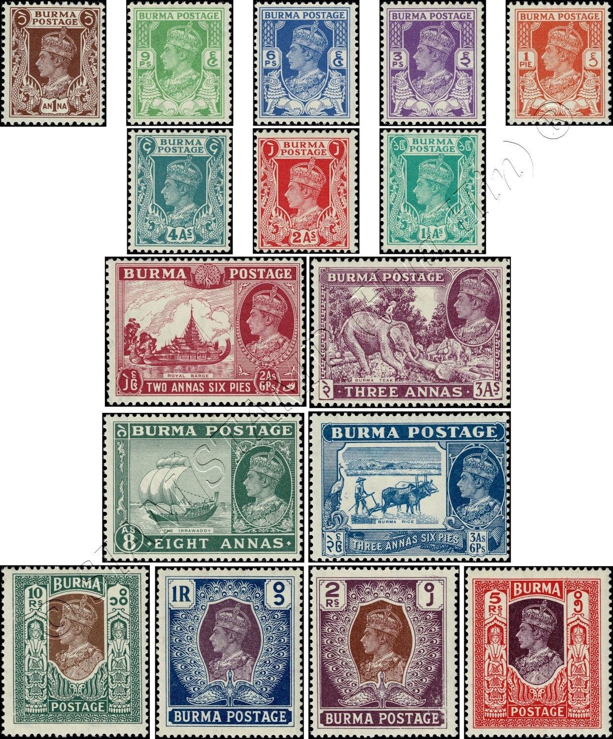Grade: VG/F (Very Good/Fine) Definitive: King George VI - Native Representations (MNH) ARTICLE DESCRIPTION: MiNo. 0019A - 0034A BurmaOpr.; Wmk 2; A = perf. K 14, landscape formats A = perf. K 13 1/2: 13; B = imperf ... Read More
