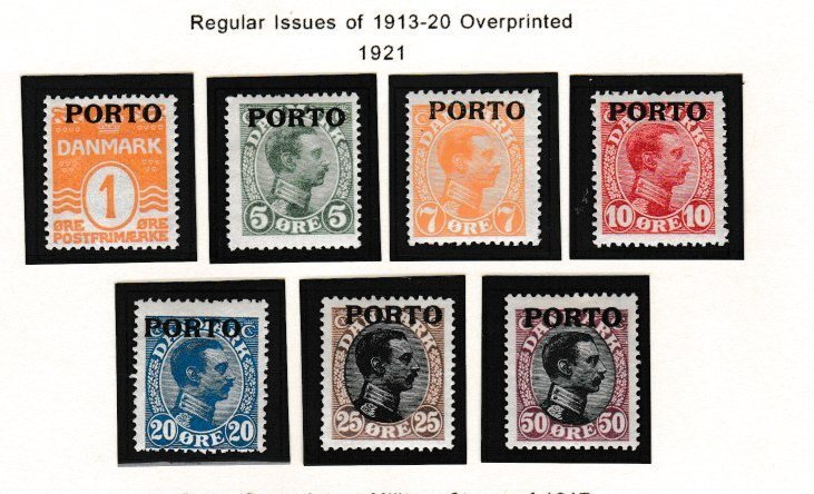 Denmark: Scott catalogue # J1-7, a complete set, mint hinged. Catalogue value for a hinged set is $ 110.00. Selling at 1/2 of the hinged catalogue value.