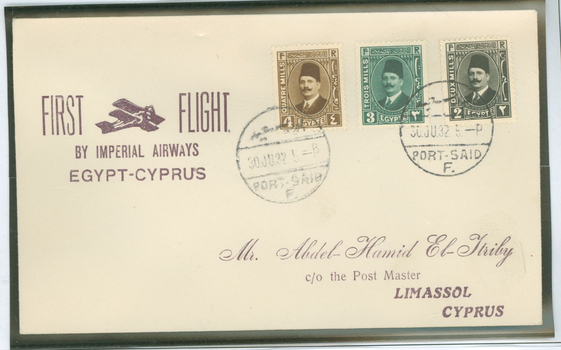 1932 Airmail Cover, Port Said 6/30/32 to Cyprus, First FlightAPS Stamp Id: 501684183