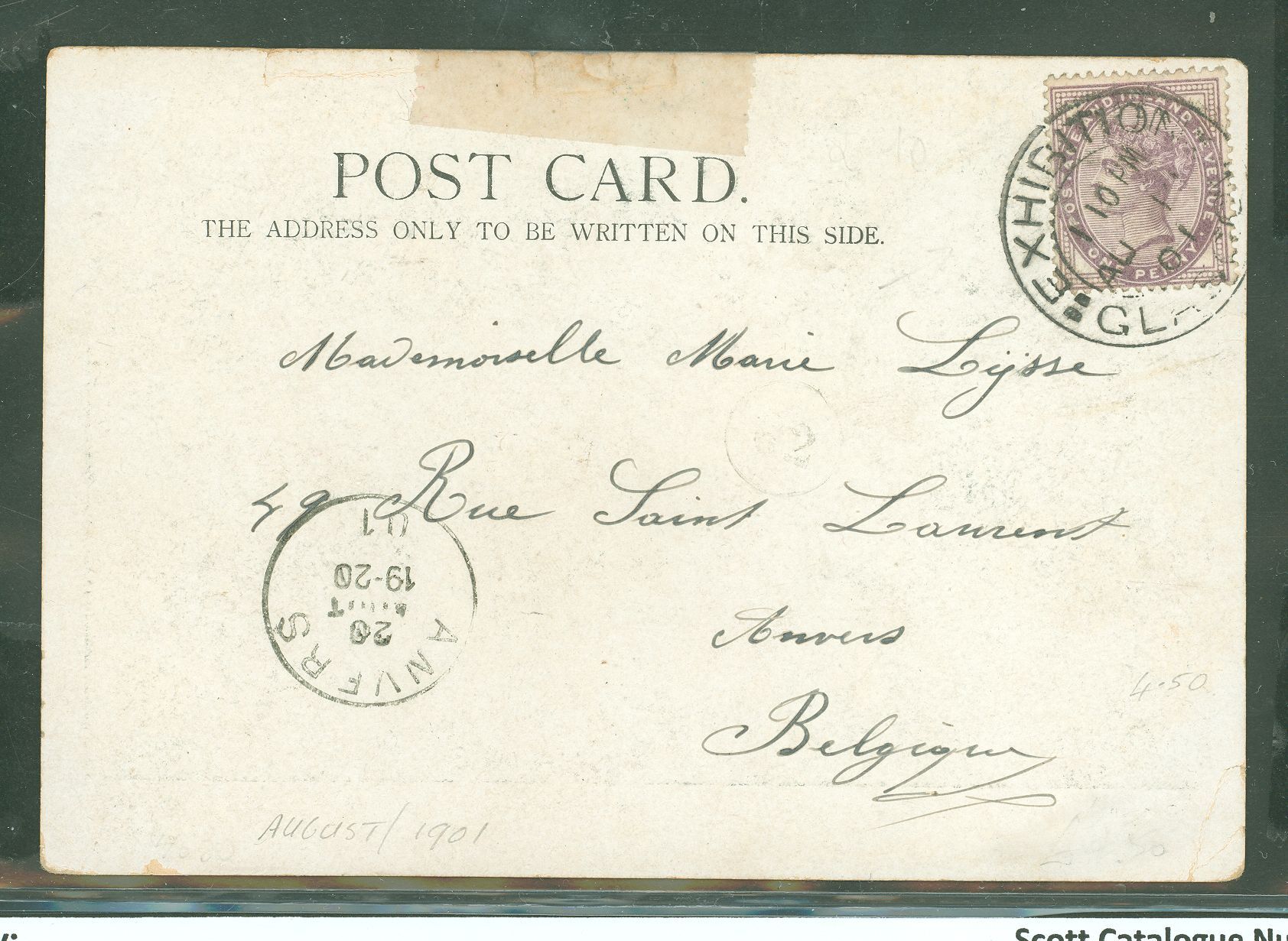 Glasgow Exhibition Cxl. on letter to Anvers, Belgium, August 1,1901. Repaired at top center. APS Stamp Id: 501568943 APS Seller Id: 524824 Hinge Type: Not Specified