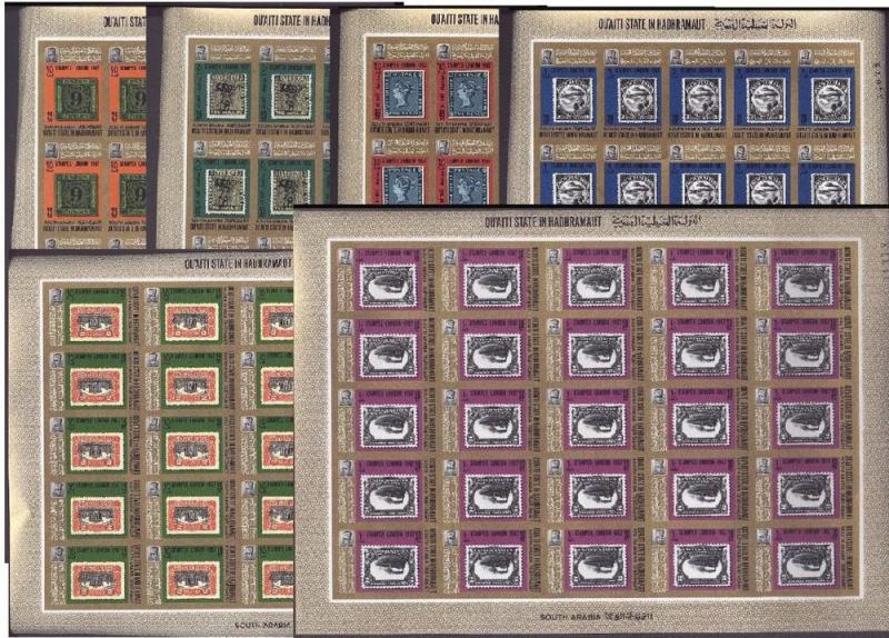 Famous errors on stamps (e. g. with inverted Jenny) from Aden Qu'aiti State in Hadhramaut, issue 1967, complete imperforated set in full sheets of 25 stamps each, very fine, mint never hinged, Mi #98B-104B, Euros 300+ (~$380+).Seller Information