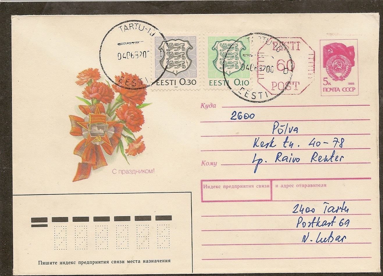 Scott 201,203 and Handstamped postage, on Russian stamped envelope