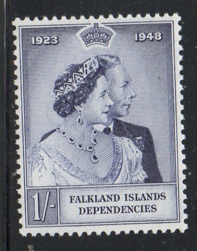 Falkland Island Dependencies Scott Catalogue number 1L12 1949 1 shilling Silver Wedding Anniversary George VI &Queen Elizabeth stamp .Mint, fine to very fine, original gum never hinged .