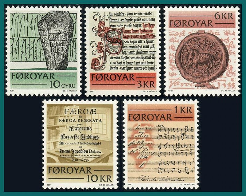 Full set of stamps showing historic writings of the Faroes: rune stone; score of folksong, 1846; manuscript of Sheep Farming Law, 1298; seal showing heraldic ram, 1533; and title page of 'Faeroae et Faeroa Reserata'.The scan is an example of the set you will receive.