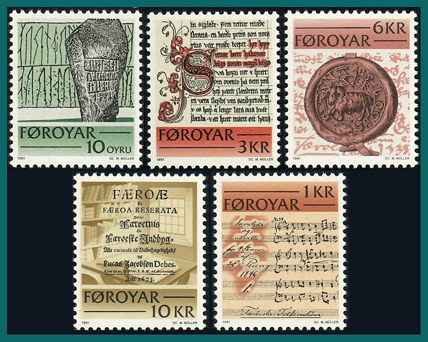 Full set of stamps showing historic writings of the Faroes: rune stone; score of folksong, 1846; manuscript of Sheep Farming Law, 1298; seal showing heraldic ram, 1533; and title page of 'Faeroae et Faeroa Reserata' ... Read More
