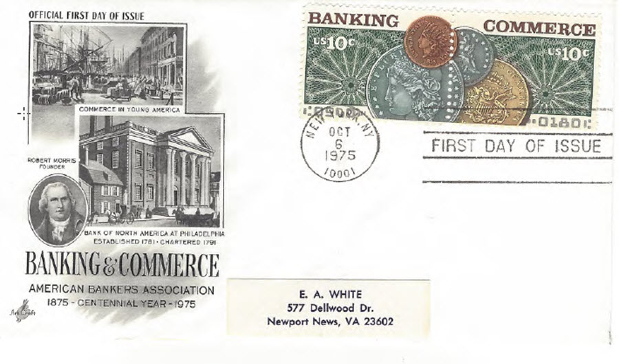 First Day Cover for Banking and Commerce se-tenant pair Issued 6 Oct 1975 at New York 10001. Has address stick on bottom center of envelop.Seller Information