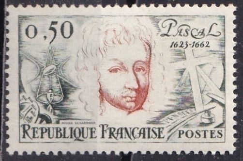 France 1038 (mnh, light gum toning) 50c Blaise Pascal, sl grn & dp org (1962)
