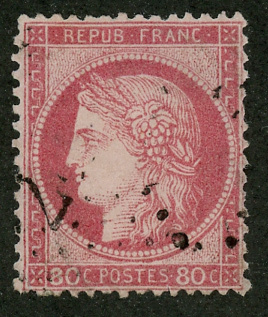 France, Scott# 63 used; 1872, Ceres. CV $13.50. Light Cancellation, tight margins all around. Missing perf on upper left corner.