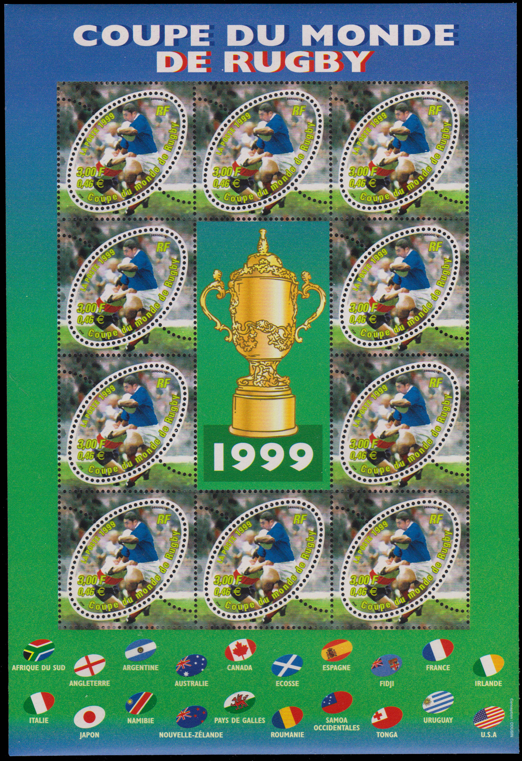 3F, 3F, 3F, 3F, 3F, 3F, 3F, 3F, 3F and 3F 1999 Rugby World Cup Miniature Sheet with center label. Mint never hinged.