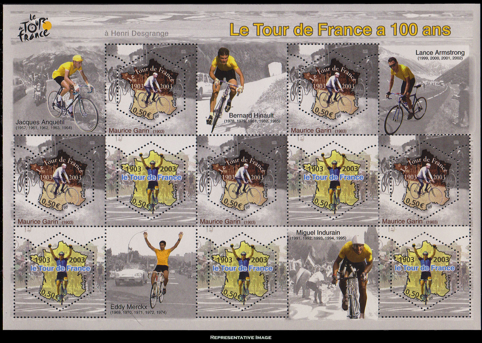 50c Maurice Garin and 50c Cyclist with Arms Raised Vertical Pair (5) Tour de France Se-tenant Miniature Sheet of 10 with 5 Labels. Mint never hinged.Seller Information