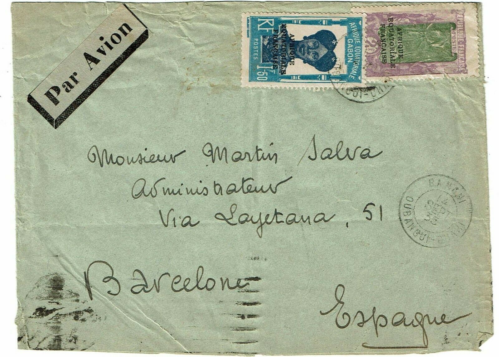 French Equatorial Africa 1935 Ubangi-Shari cancel on cover to SPAIN