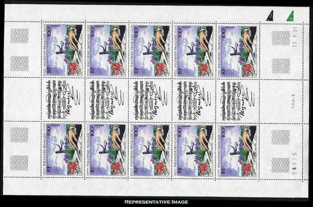 100F, 100F, 100F, 100F, 100F, 100F, 100F, 100F, 100F and 100F Mozart Sheet of ten with five labels. Mint never hinged.