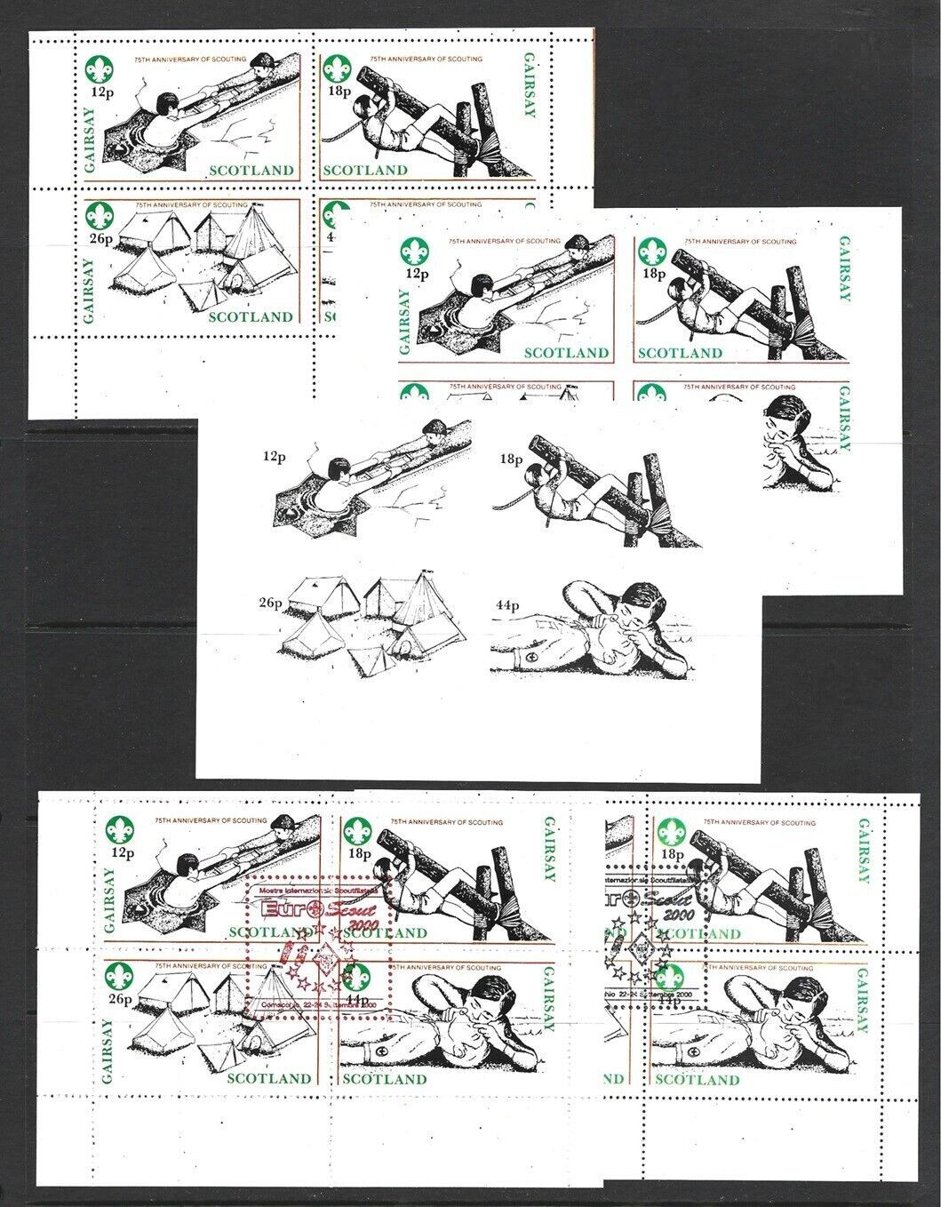 GAIRSAY Scout Local Sheets 5 diff. (Perf. (Slightly faulty), Imperf, Black print Trial, Ovptd in Red, Ovptd in Black) VF-NH.Gairsay is a small island in Orkney, within in the Mainland parish of Rendall, but 1 a mile and half off the coast of Scotland.Clive Feigenbaum printed these stamps in London. These Feigenbaum issues did not see any postal use and are considered as Fantasy stamps or Bogus but they deserve their place in the history of philately and can therefore be collected as such. Pursuant to the guidelines for all sales of tangible goods, taxes will be collected and remitted to the appropriate tax authorities. Possible Customs charges, depending on the rules in force in the country of destination. All lots are guaranteed. If you consider that the lot is not as described, you can send it back for full refund (except certification and registration cost) within 30 days of purchase. Member: The Royal Philatelic Society of Canada The Christmas Seal & Charity Stamp Society Haiti Philatelic Society The British North America Philatelic SocietySeller Information