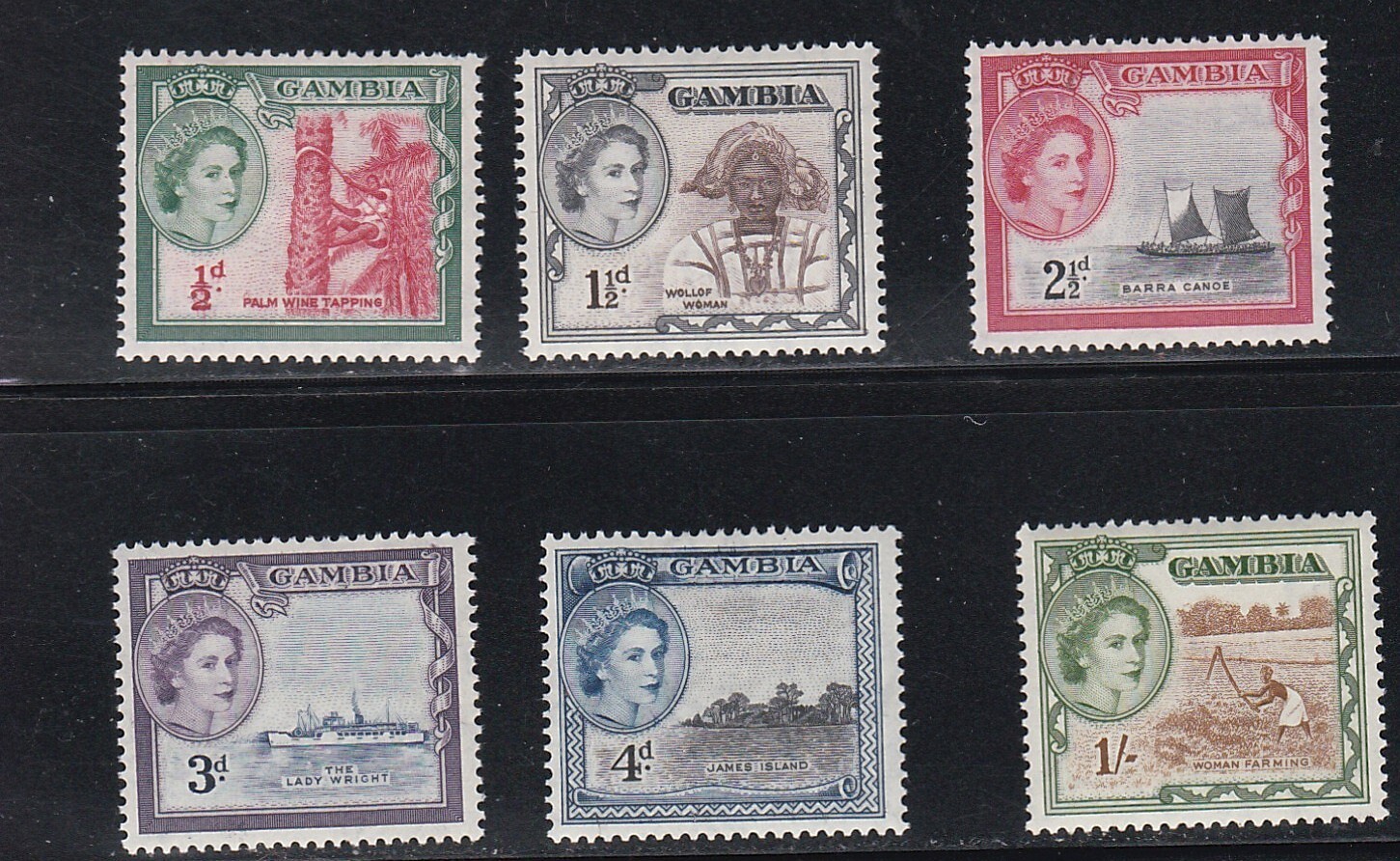 Gambia: Scott catalogue # 153, 155-158, 160, not a complete set, mint hinged. Catalogue value is $ 6.50. Selling for 1/3 of catalogue value.