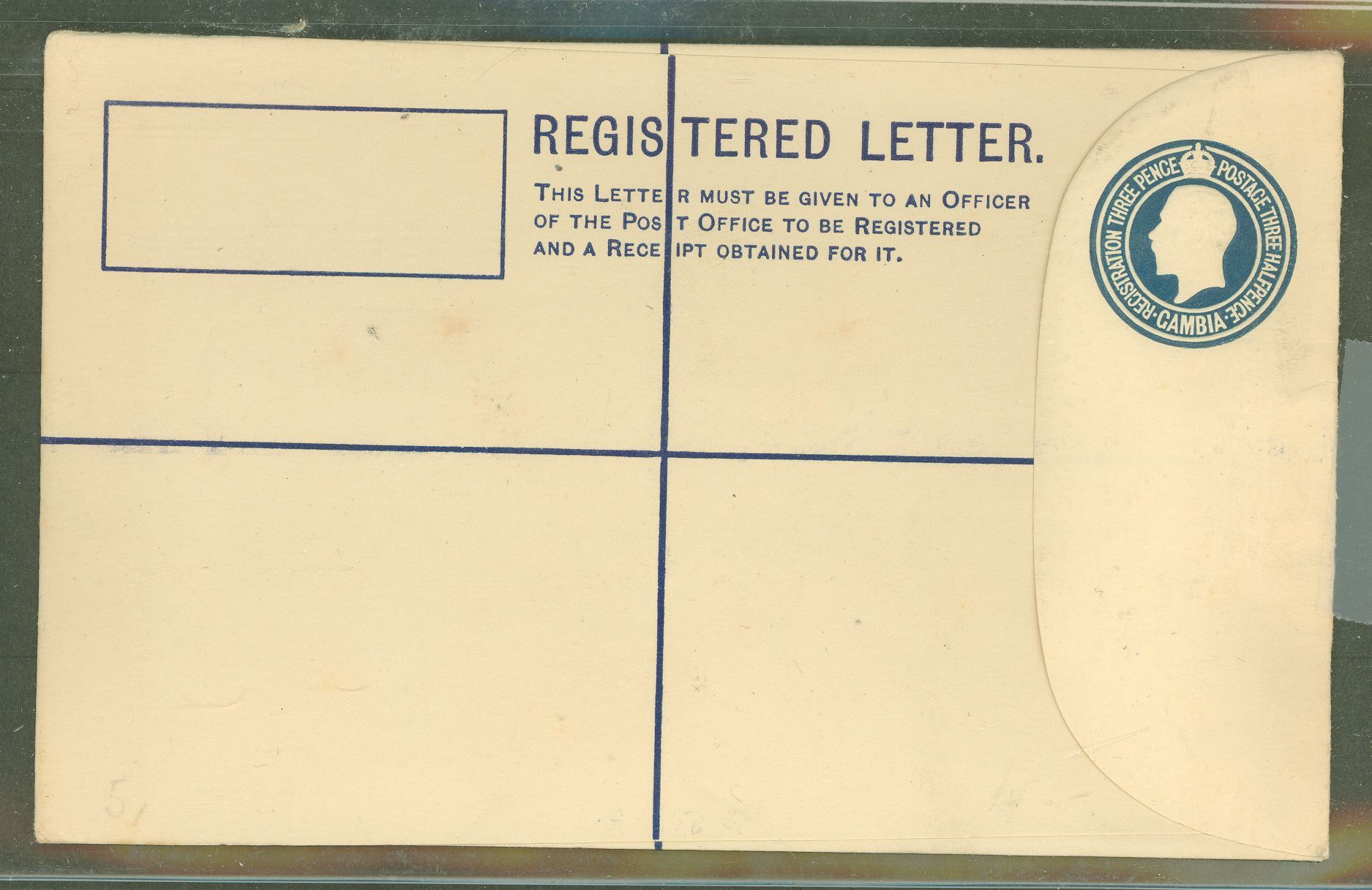 Gambia 1924 KG V, 3c & 1.5c reg. env, size G, very clean, flap is not stuck.