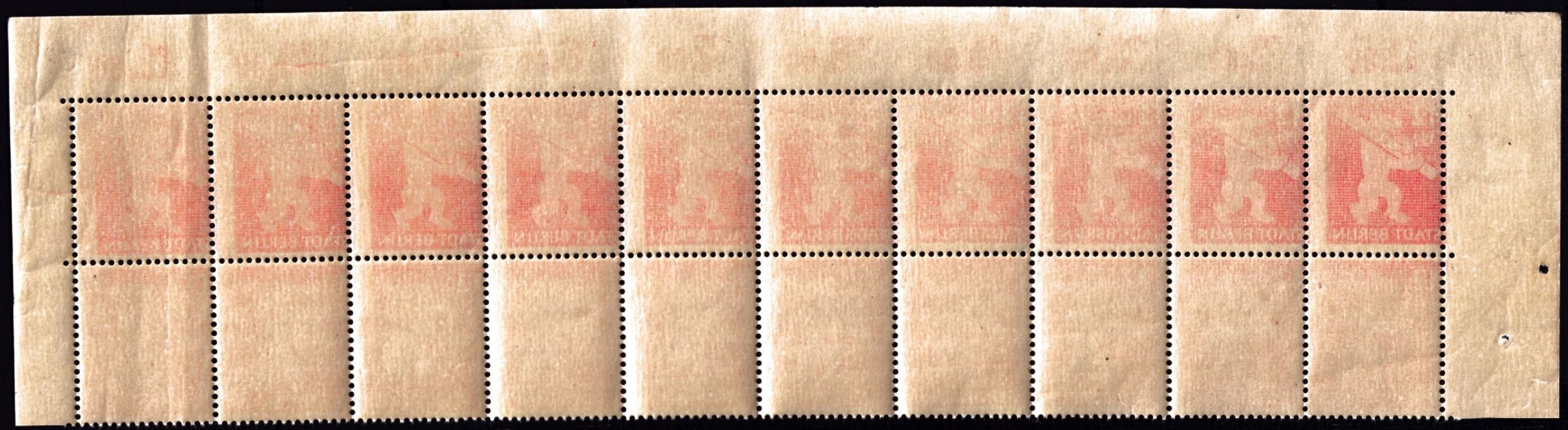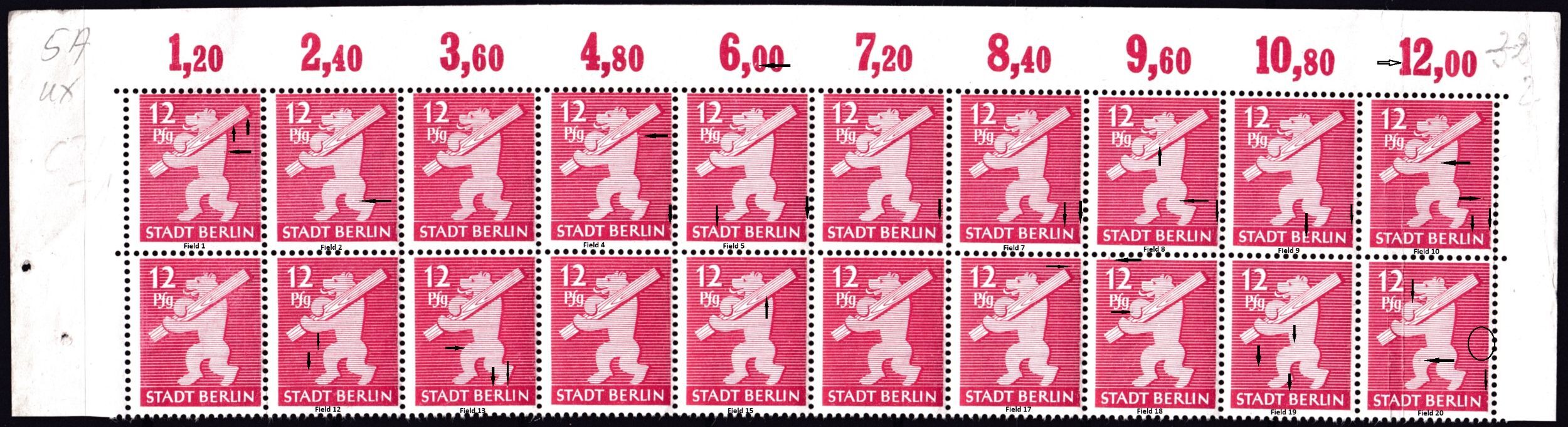 12Pf Berlin Bear with Log, Sheet CI, paper type uy - Fields 1-20 in Block, Plate Errors. Abklatch on entire 1st row Michel Spezial #; value ? not listed in our Michel Among other things (see error list below) th ... Read More