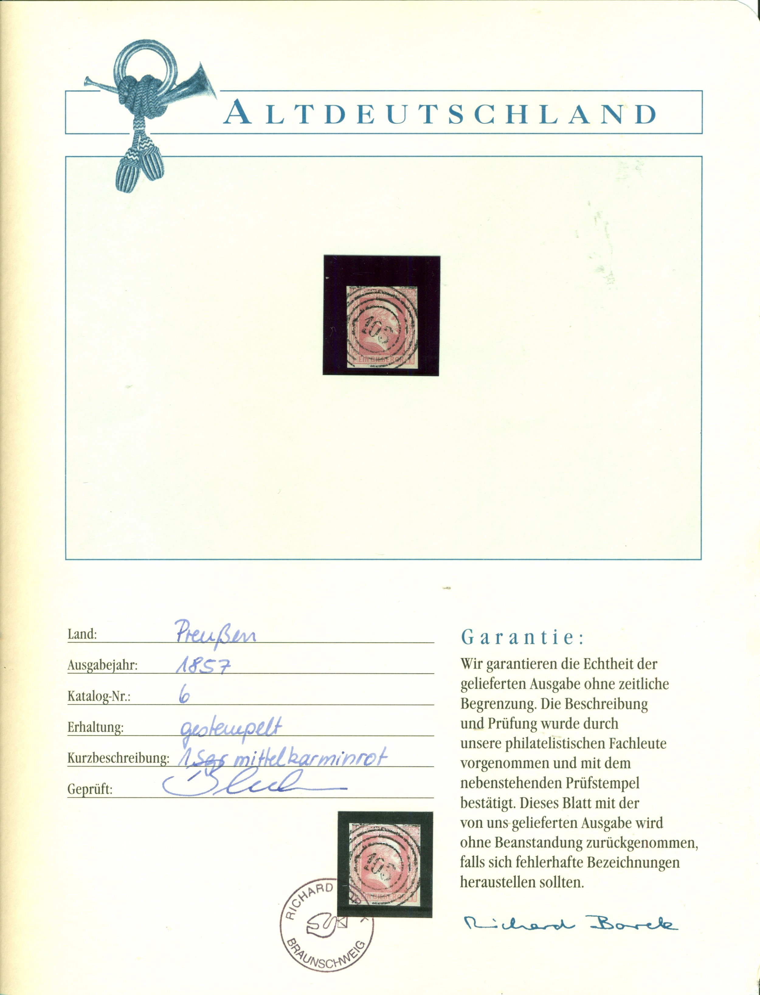 Germany (Prussia) 1857 #6 U** SCV(2020)=$35.00 Note: Certificated album page