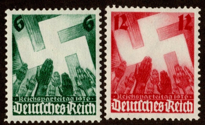 6pf and 12pf Salute to Swastika 21936 Nazi Congress. Unused lightly hinged.Seller Information