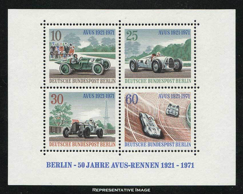 Berlin 10pf, 25pf, 30pf and 60pf Racing Cars Se-tenant Souvenir Sheet of four. Mint never hinged.Seller Information