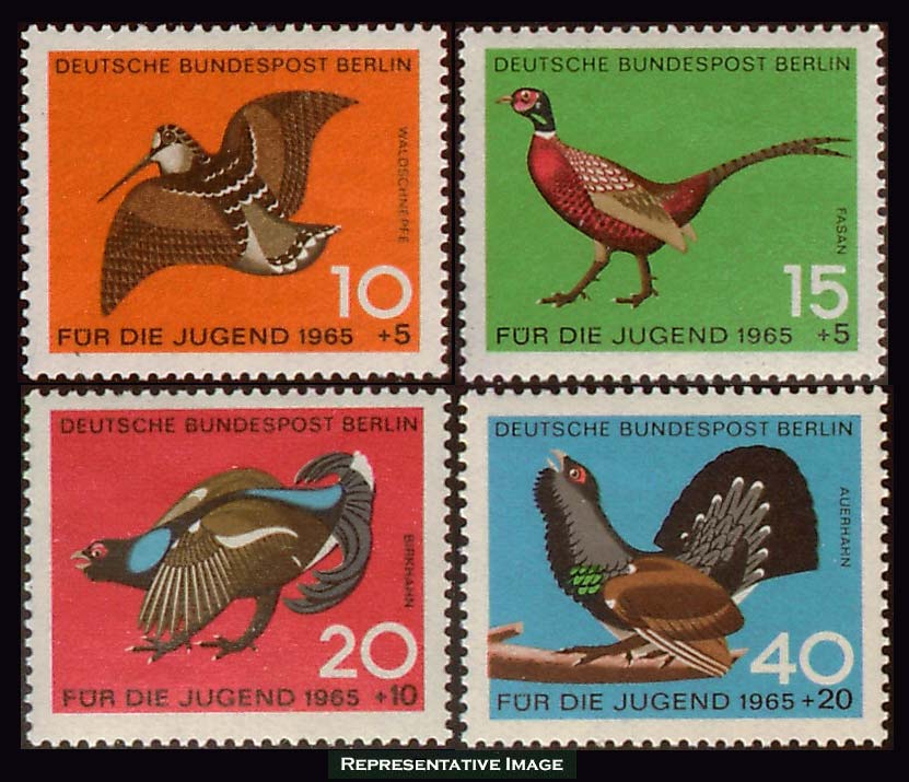 10pf+5pf Woodcock, 20pf+10pf Ring-necked Pheasant, 30pf+15pf Black Grouse and 50pf+25pf Capercaillie Birds Young People Semi-Postal. Mint never hinged.
