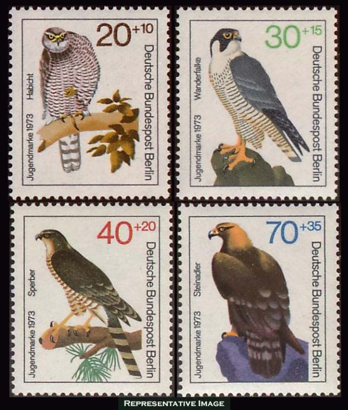Berlin 20pf+10pf Goshawk, 30pf+15pf Peregrine Falcon, 40pf+20pf Sparrow Hawk and 70pf+35pf Golden Eagle Birds of Prey Semi-Postal for Benefit of Young People. Mint never hinged.Seller Information
