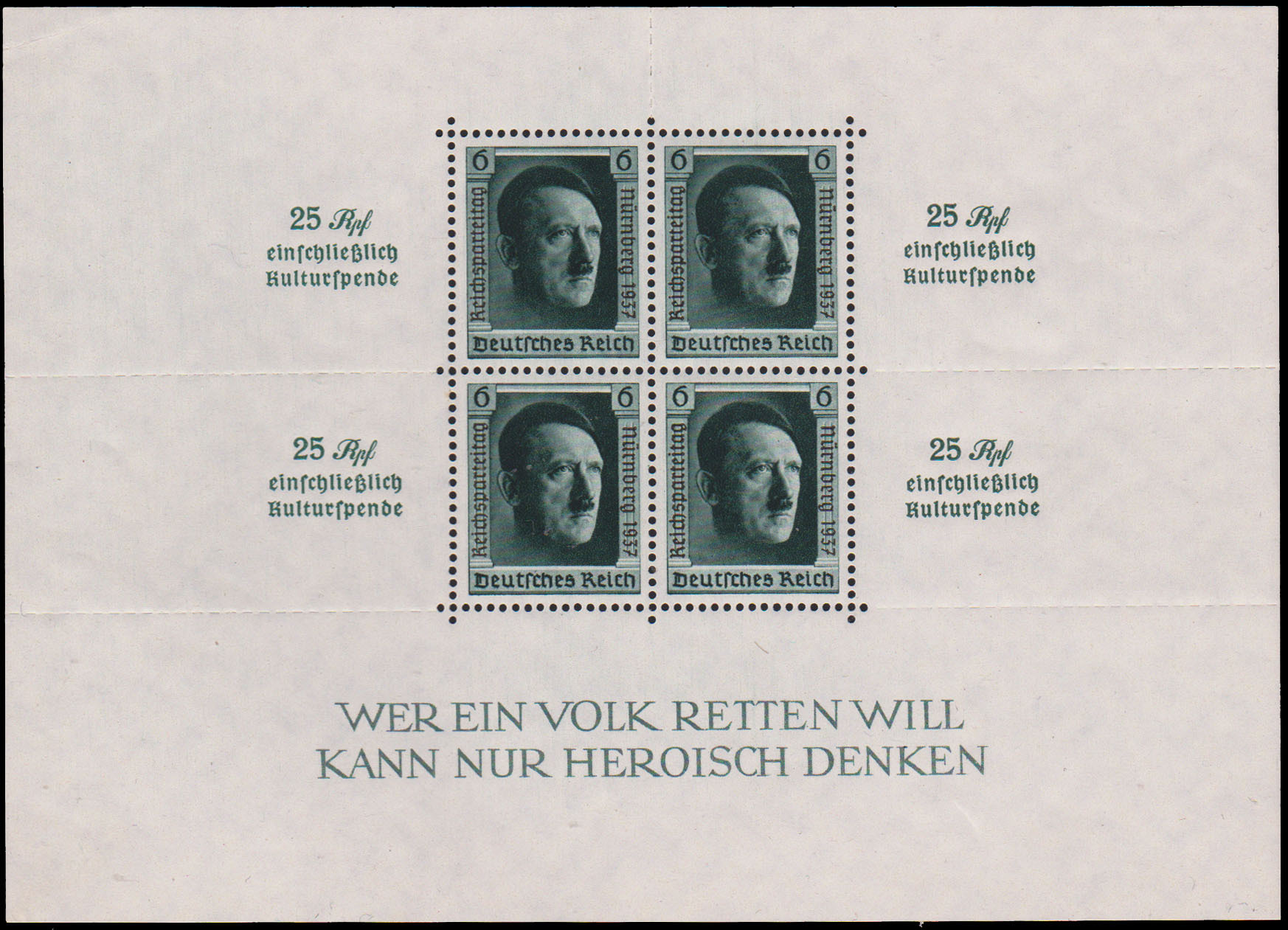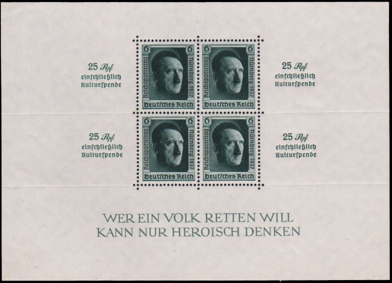 6pf+6pf 48th Birthday of Hitler with Rouletted Perforations in Margins Semi-Postal Overprinted Reichspatteitag Nuremburg 1937 Souvenir Sheet 1937 Nazi Congress at Nuremburg. Mint never hinged.