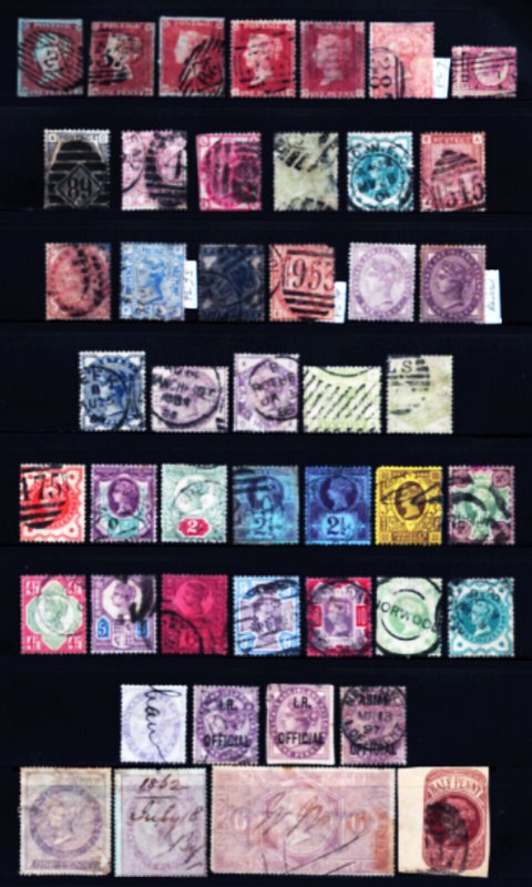 Great Britain #3 / #25, Official, Revenues - An Amazing Queen Victoria Collection, nearly complete, many higher values Note:1841 imperf One Penny on Bluish paper, #40 bluish paper VF mint hinged, some rare plates, most used hinged with some hinge remnants/adherence, but better centering on most with many "socked-on-the-nore" cancels, a few small faults as expected factored into pricing, most Bright and Fresh 46 items