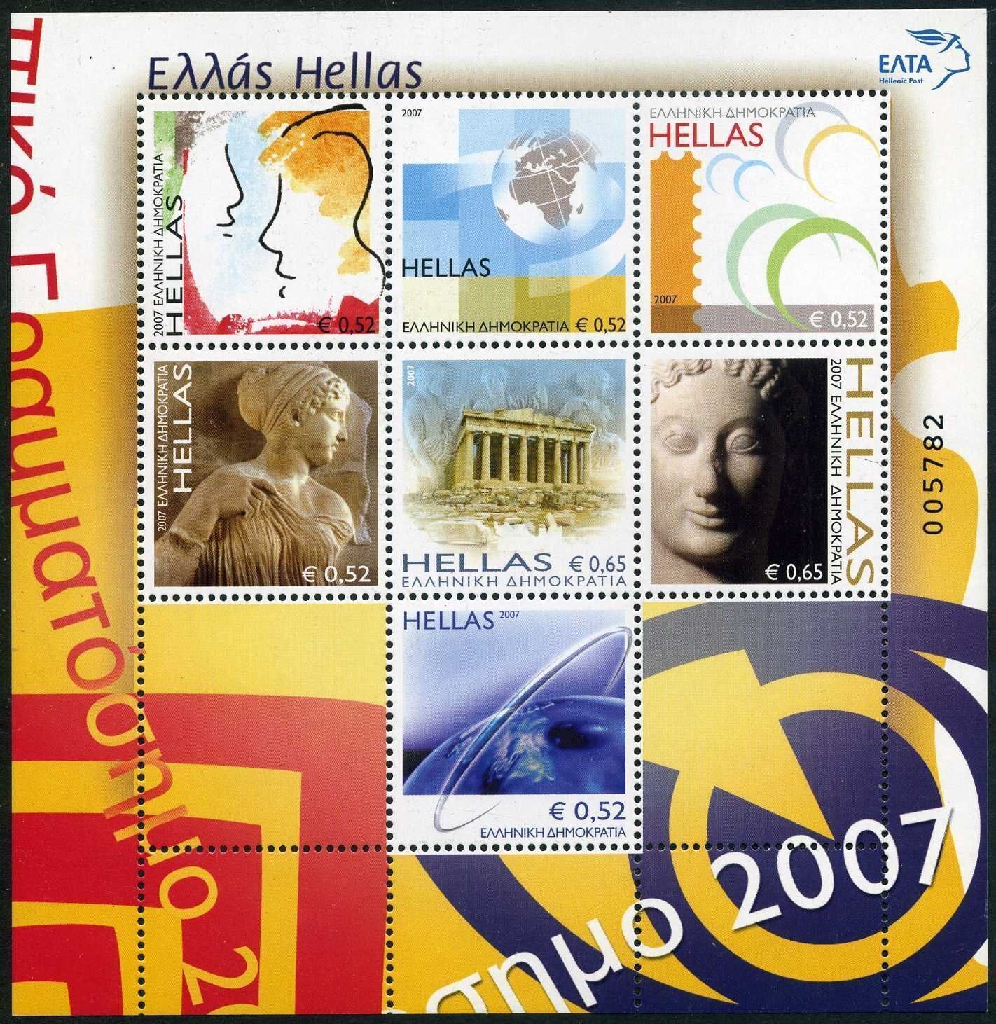 Greece 2296a sheet, MNH. Faces, Globe, Crescents, Artemis, Ring around Earth, Parthenon, Phrasikleia Kore. $0.05 shipping for each additional eligible item you buy . For domestic purchases up to $60.00 first class mail will be used; purchases above $60.00 require mail with tracking number or insured mail (buyer pays the mail fee). For international purchases up to $60.00 first class international airmail will be used; purchases over $60.00 require mail with tracking number (registered mail, buyer pays the $19.00 or $20.00 for oversize item). Warning for the buyers from Eastern European countries, Russia, China, Middle East, South Asia, Latin America, Africa exclude RSA, and the buyers with Hip ID less 100: the purchases over $30.00 require expedited mail.Seller Information