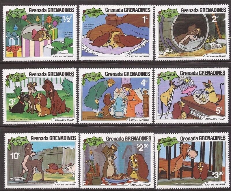 Grade: UngradedGrenada Grenadines - 1981 Lady and the Tramp - 9 Stamp Set - Scott #450-8 Country: Grenada Grenadines, Year of Issue: 1981, Type: 9 Stamp Set, F/VF MNH, Topic: Disney, Animation, Characters, Lady and the Tramp, Christmas, Holiday, Catalog #: Scott 450-8