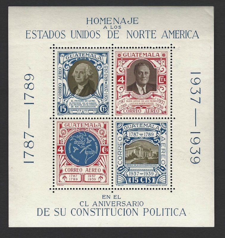 Guatemala souvenir sheet celebrating the 150th anniversary of the US constitution - FDR, George Washington, map of the Americas, Pan-American Union BuildingSeller Information