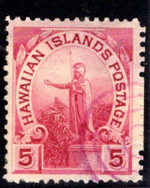 The item in this listing is a single used Hawaiian postage stamp listed in Scott as #76, and issued in 1894. The stamp has a face value of 5 cents and shows the world-famous statue of King Kamehameha the Great in Honolulu, which now appears on the Hawai`i addition to the “50 State Quarters” series.This example of Scott #76 was cancelled with a red ink target cancel of a type used nation-wide in Hawai`i in the 1890's--but most typically on registered mail if applied in red as shown. Please note: There is some adhesion from the 19th century envelope remaining on the back of the stamp.