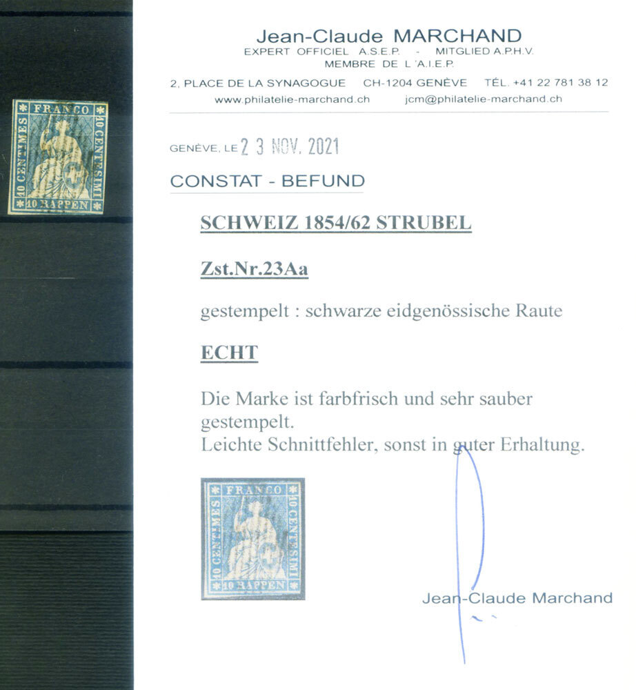 Helvetia seat, 10 rp. light Prussian blue. Monaco first run. Merchant Certified. Zumstein spec.: 23Aa (.) - CHF 1,300.We list our items on different sites (Hip, Hip, Hipstamp, eBid, Oldthing). Do not buy the same item from different sites because each item is available in one piece only.
