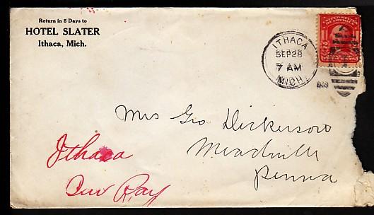 Hotel Slater Ithaca Mi 1909 cover COT