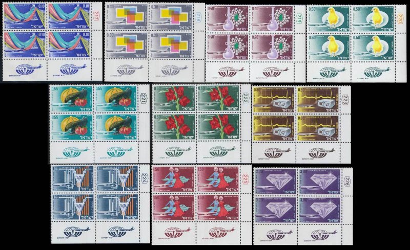 10a, 30a, 40a, 50a, 55a, 60a, 80a, £1, £1.50 and £3 Israeli Exports Blocks with tabs Airmail. Mint never hinged.