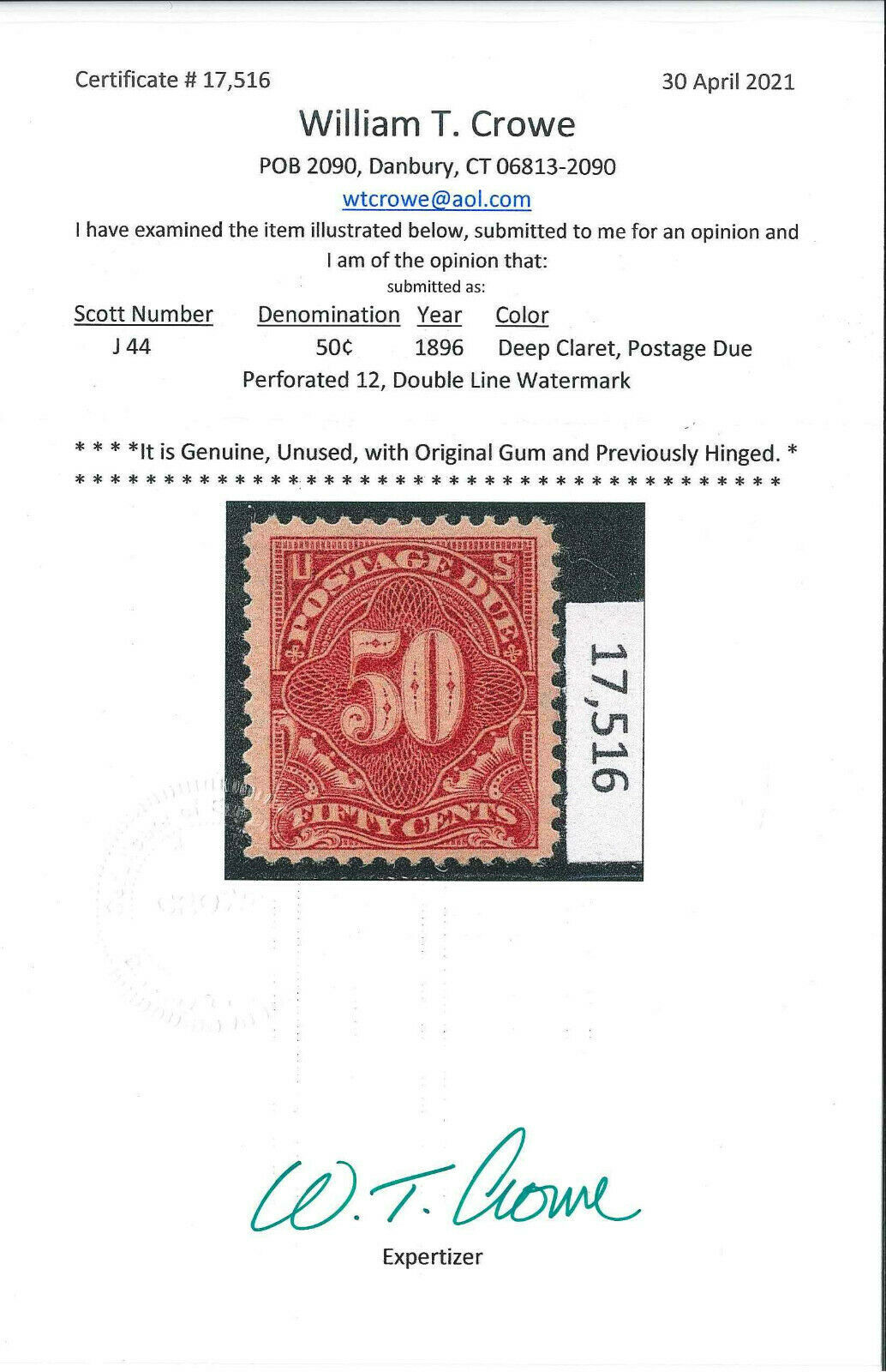 J44 Mint LH OG Very Fine Crowe Cert