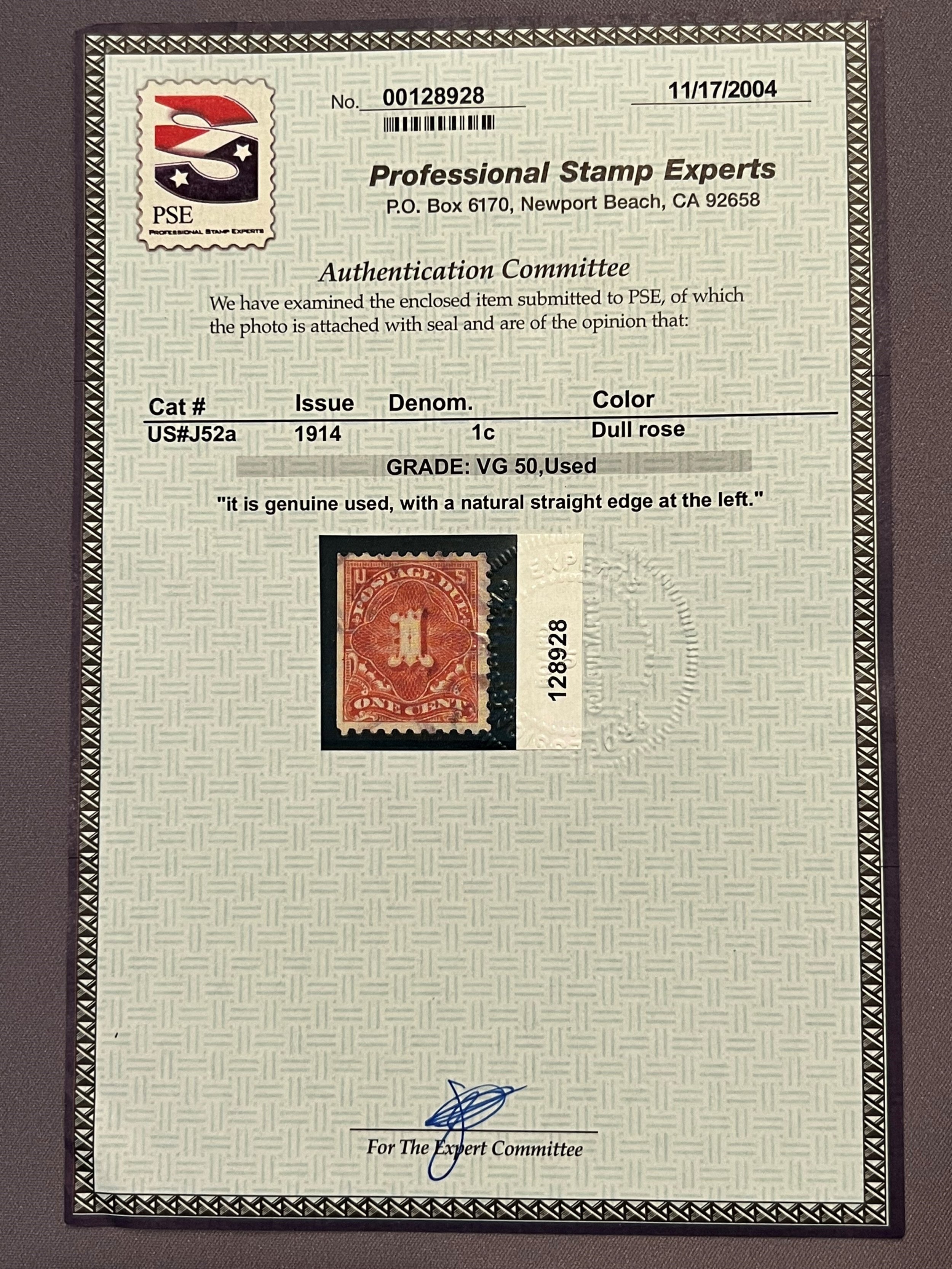J52a, Postage Due, Used, Cert, VGSeller Information