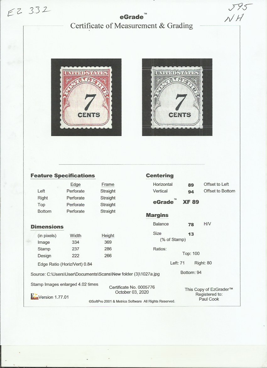 This is a centering grade only. P.S.E. May grade higher or lower. I ship the print out of ez-grader with the stamp. There are XF+ items through out ALL of my listings. These are simply the ones I noticed. The pictured U.S. postage stamp shows the stamp you will receive.Seller Information