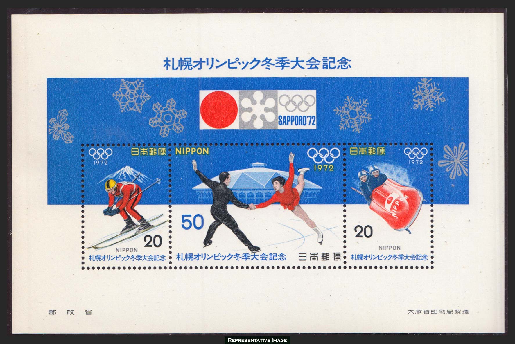 20y Downhill Sking, 20y Bobsledding, and 50y Figure Skating Pairs 1972 Olympics Souvenir Sheet. Mint never hinged.
