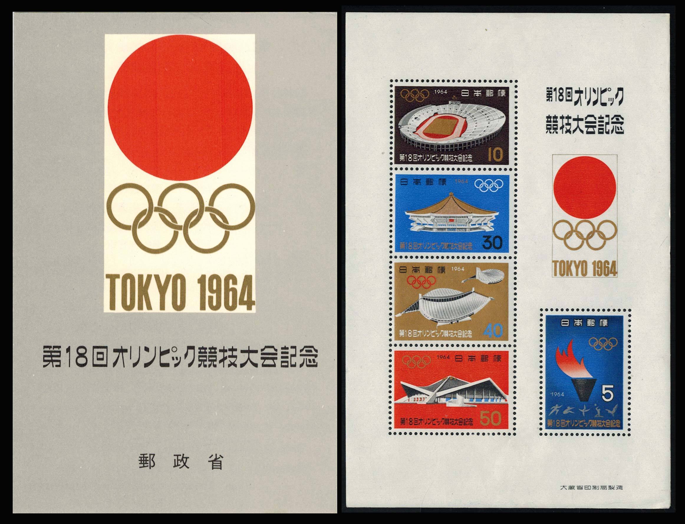 5Y Athletes and Olympic Flame, 10Y National Stadium, 30Y Fencing Hall, 40Y National Gymnasium and 50Y Komazawa Gymnasium 1964 Olympic Games Souvenir Sheet Presentation Pack. Mint never hinged.Seller Information