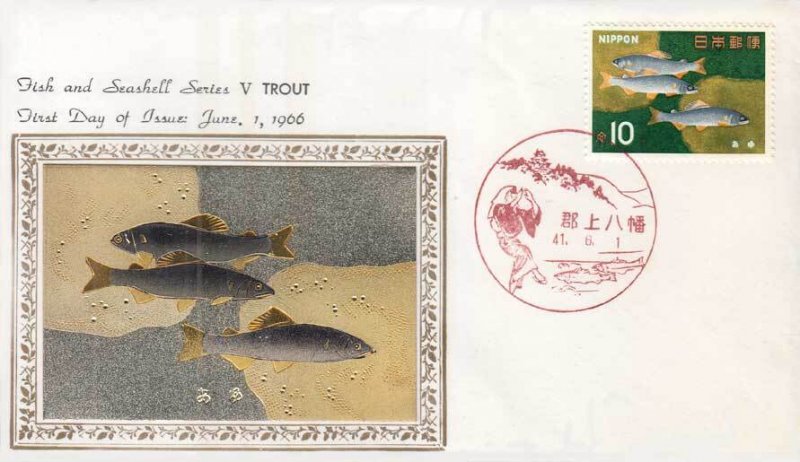 10y Ayu Fish and Seashell with illustrated postmark. First Day. Artistic Etched Metallic Cachet. Mint never hinged.Seller Information