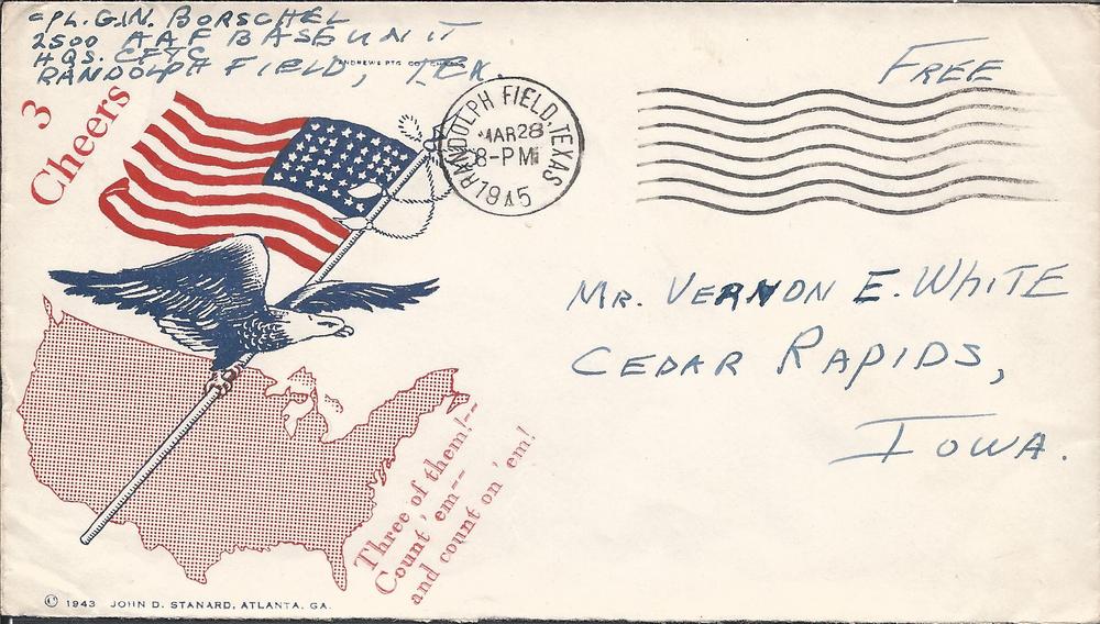 John D. Stanard, WWII Related, "3 Cheers", Eagle on Flag over Outline of US, "Three of them!/ Count 'em/ and Count on 'em!", EF
