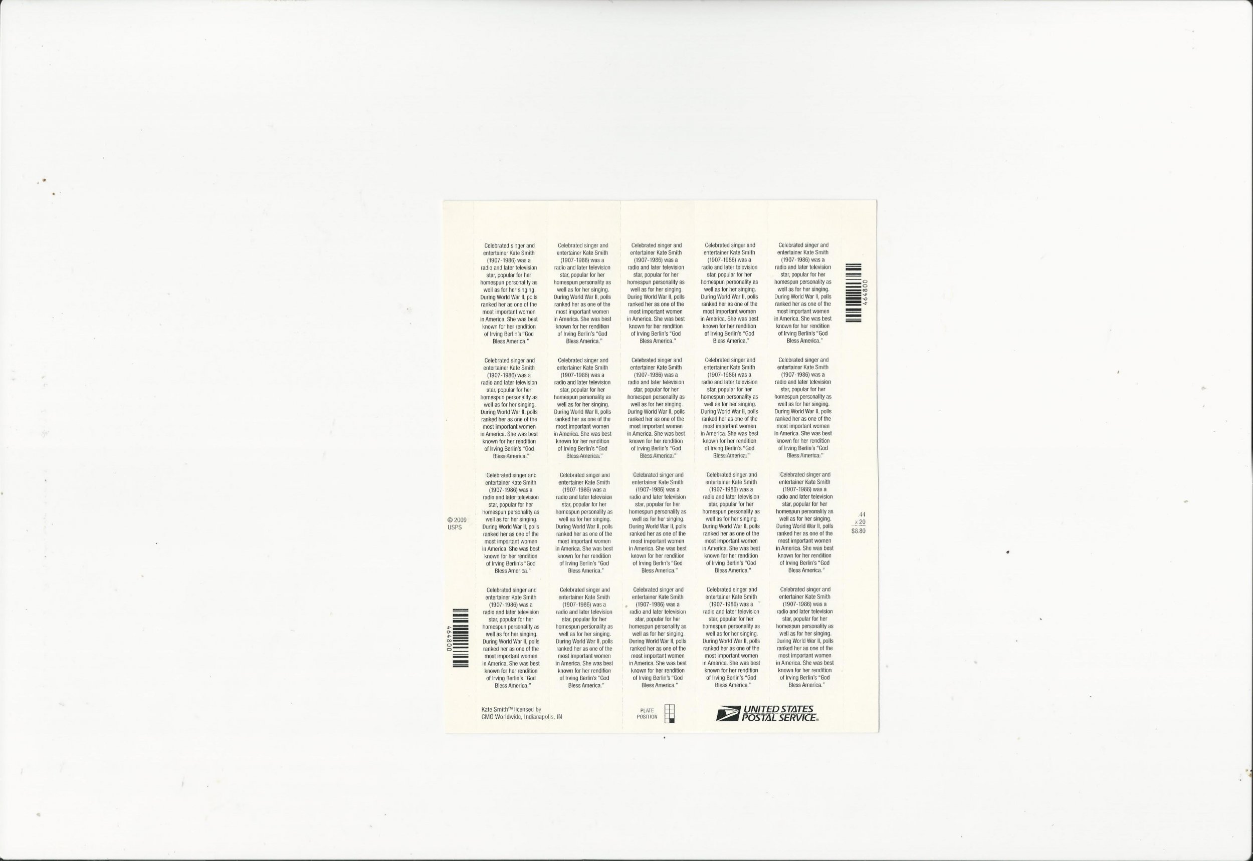 Kate Smith Scott #4463 MNH F-VF OG Post Office fresh 20 X 44 cents FV$8.80Seller Information