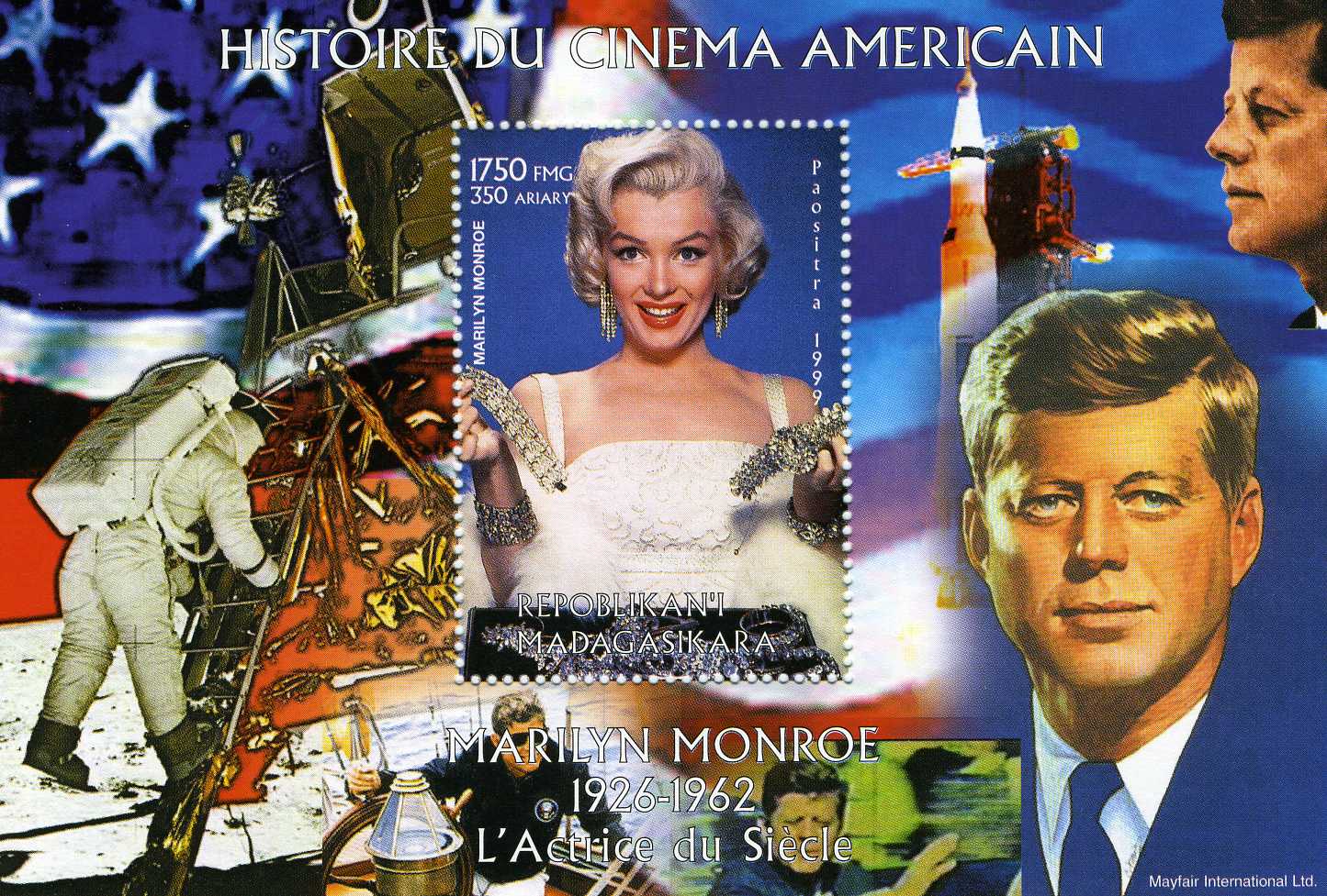 Madagascar 30.10.1999 John F.Kennedy Marilyn Monroe History of the American Cinema - Space Astronaut Armstrong - Fusse Saturn Souvenir Sheet Perforated MNH VF Condition . - Space Catalogue # MAD 9/17BSeller Information