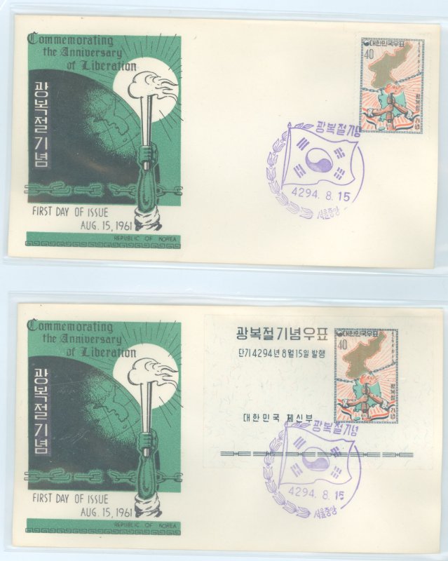 1961 Liberation - sixteenth anniversary/sheet stamp single + mini-sheet (map & tourch) on two cacheted unaddressed FDCAPS Stamp Id: 501703350