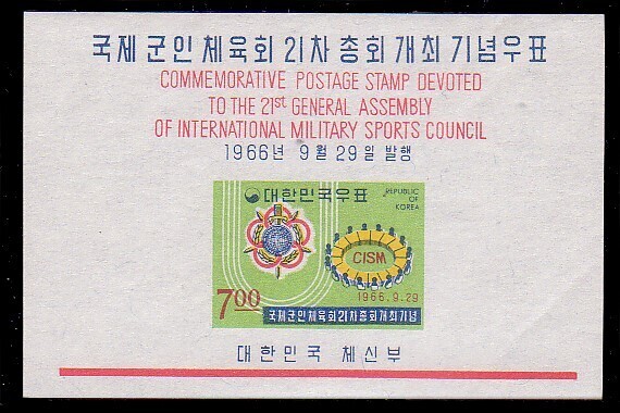 Korea, Scott #538a, 1966 21st General Assembly of the International Military Sports Council Souvenir Sheet issue in Mint Never Hinged condition.Scott 2026 Catalogue Value $3.50
